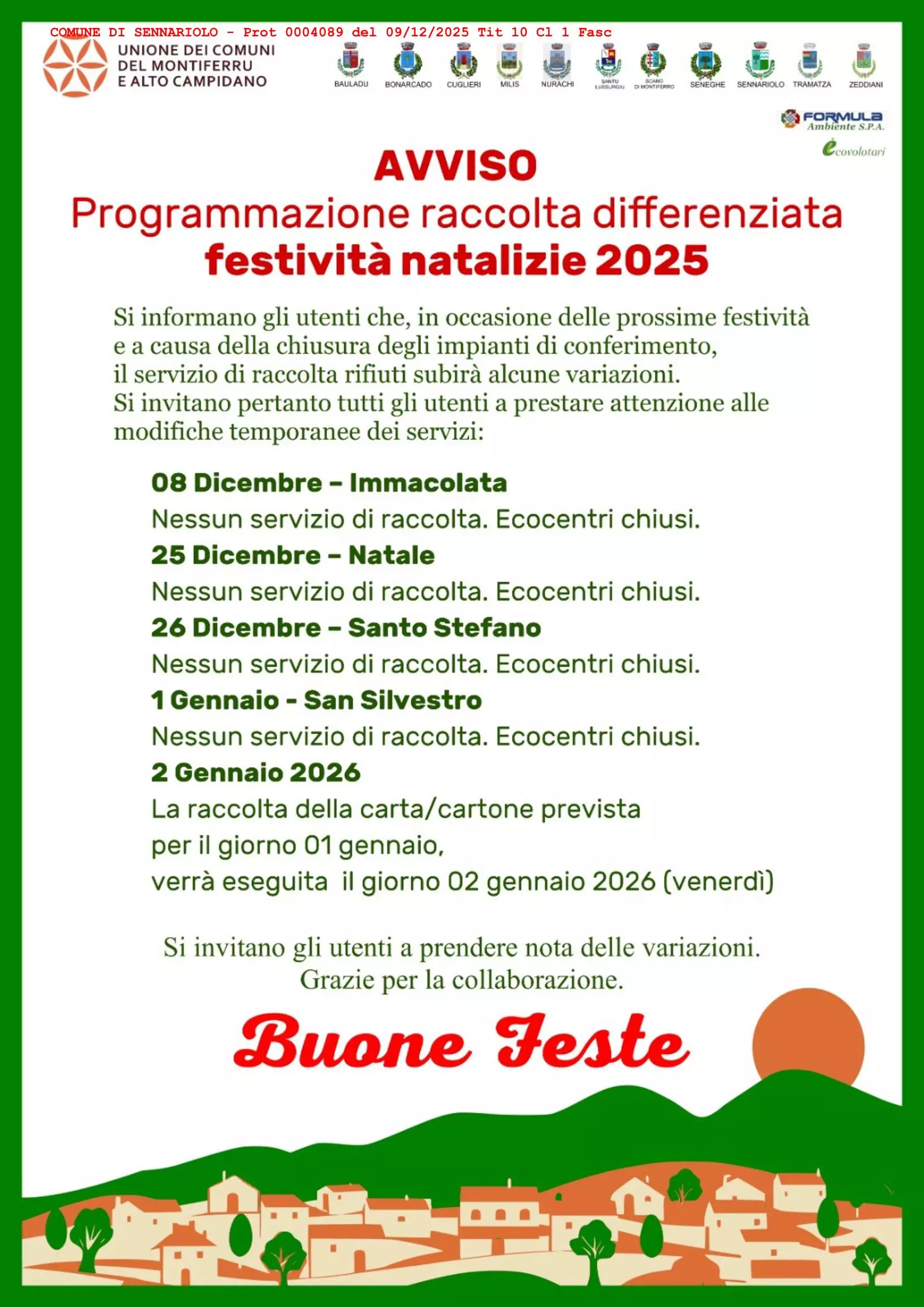 Programmazione della raccolta differenziata durante le festività natalizie 2025